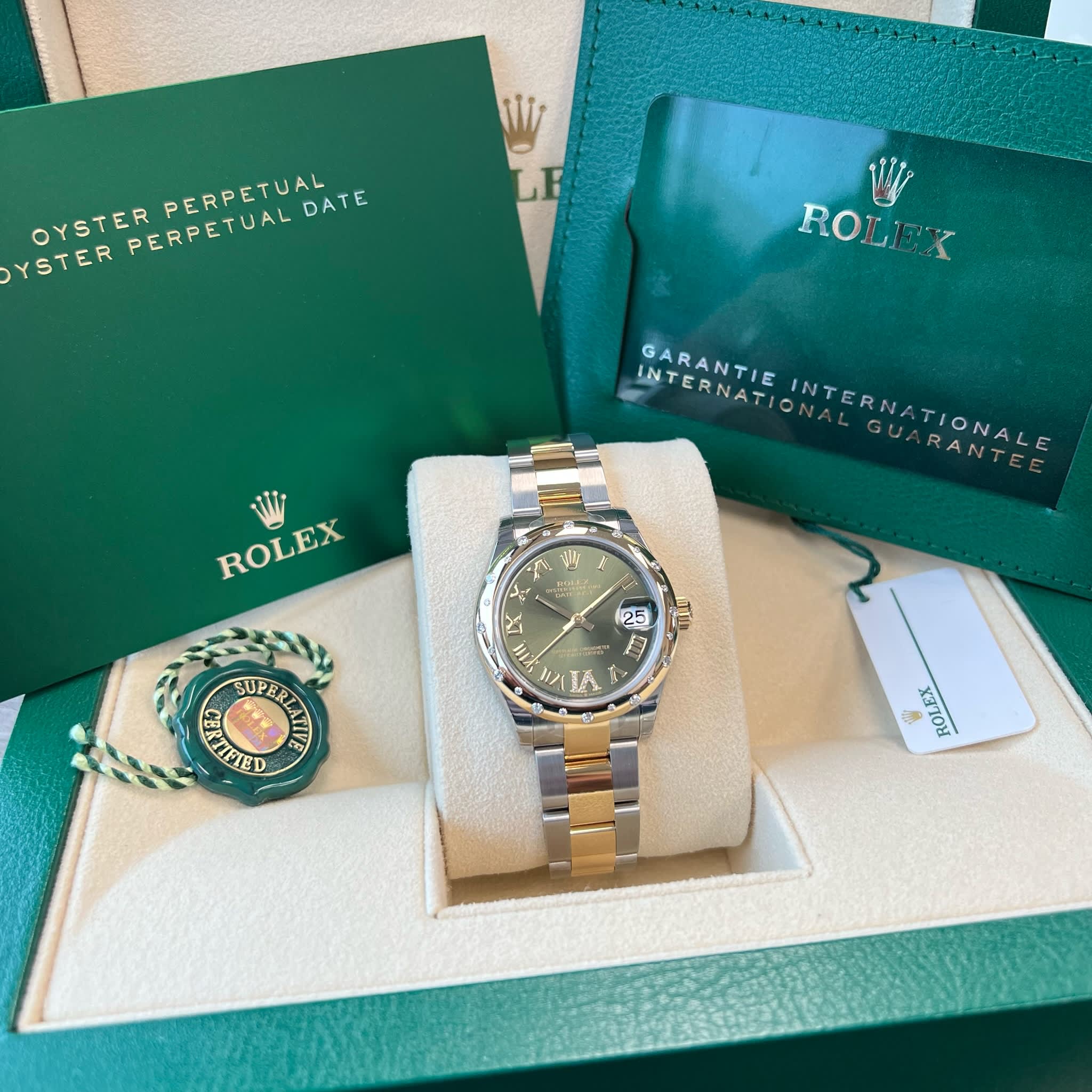 Rolex 278343RBR DateJust 31 Stainless Steel & 18K Yellow Gold Scattered Olive Green Diamond Pave 6 Dial Starlight Diamond Bezel New 2021 Box/Papers